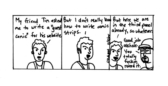 | So Tim hit 500 comics this week, as you're probably already aware. If you're not already aware, then you really have no business on this site and should go check out http://www.playskool.com. I remember looking through Tim's notebook many months ago and seeing all his old pencil drawings and rough cuts. I thought there were a lot of comics THEN. Now there's 500? That's half a thousand. To put it in perspective, if you were to print out all the comics strips and lay them end to end...there would be a shitload of paper to clean up. So I drew this "guest comic" a while ago, when Tim ran his second "guest week," but he didn't post it because it didn't get approved by the network censors. Go figure. At least you can check it out now, which is good, because a large number of people (2) have been dying to see it. And now it's 3:55am, and I'm exhausted, so I'm going to stop writing this. Good night. And congratulations, Tim. With love, Nick Lauria "Your little hoodrat friend makes me sick...but after I get sick I just get sad. Cause it burns being broke, hurts to be heartbroken, and always being both must be a drag." (Your Little Hoodrat Friend, The Hold Steady) |